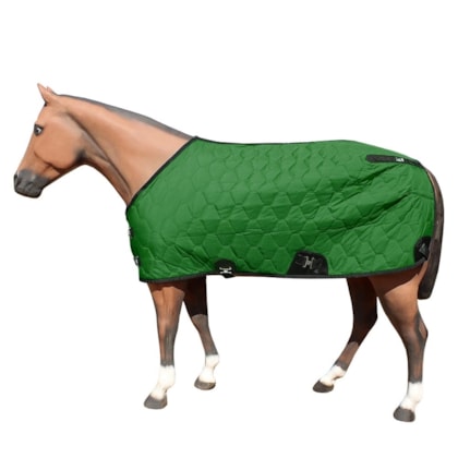 Capa para Cavalo Mreis, fabricada com nylon de paraquedas, matelado com  forro de nylon e  manta acrílica, cor Verde, fivelas de metal com acabamento em banho cromo, fita de polipropileno e reforço em couro sintético. Aberta na frente, presa entre as pernas traseiras para não virar e na frente na posição da barrigueira. Usadas em dias mais frios.